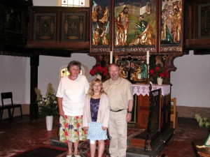 Picture 2 shows Pastor Bräunig with his grand-daughter and Frau Müller, the church warden, in front of the famous altar of Theuma.
