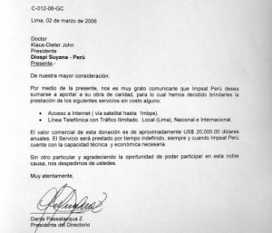 One afternoon, I visit one of the companies in the San Borja neighborhood. The owner of the company himself helps me. Trying out various projectors, I use the presentation on my laptop and that way take him through the history of Diospi Suyana. As soon as I had finished, a listener in the background asks me: “So Telefónica is not willing to help you?” “No, not at all” I say. “Maybe I can be of help” the stranger mumbles. “I am the president of the board of IMPSAT, a competing firm. Next time you are in Lima, you should present your request to the board of directors.”
